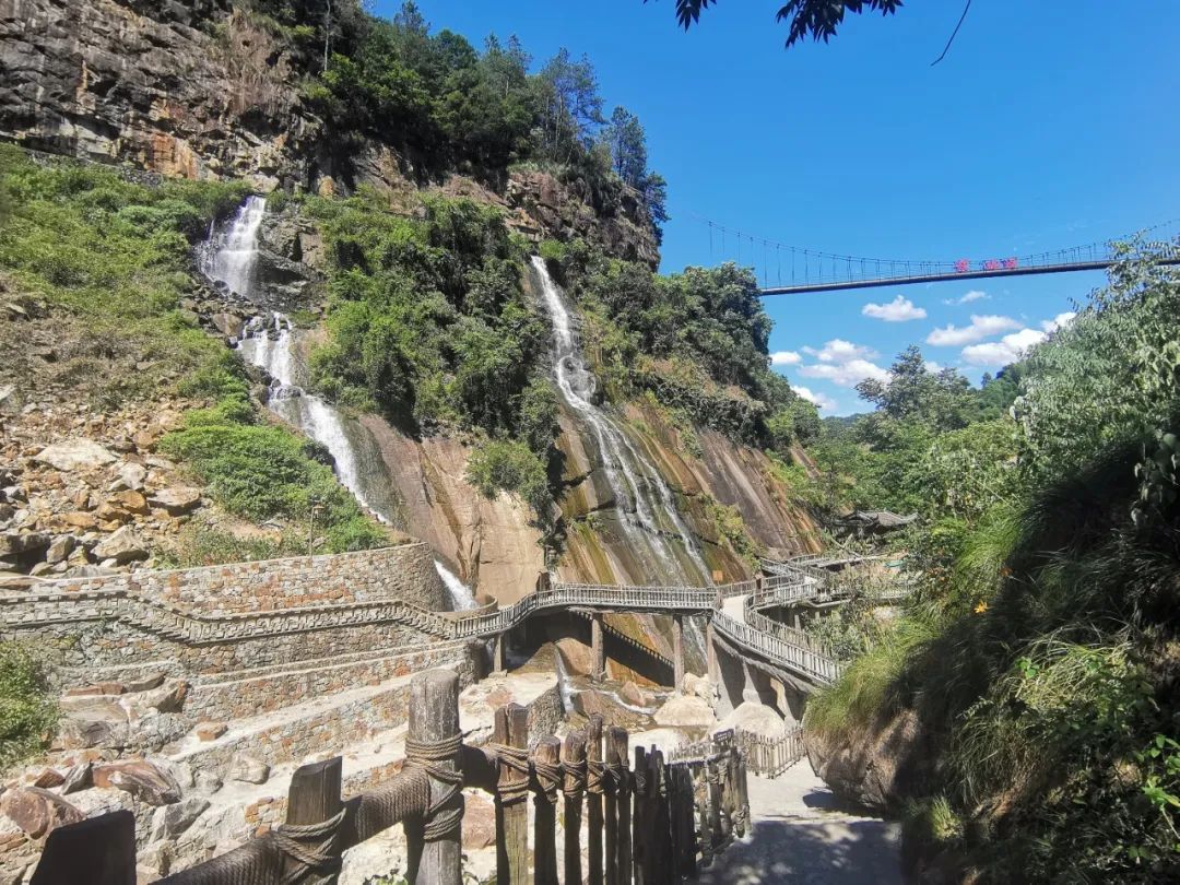 穿过青云桥,祝福各位都能平步青云;踏上由青石板铺上的寻仙路,领略栈道沿途地鸟声啾啾、水声潺潺;